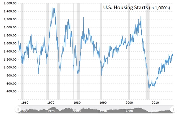The main factor contributing to the low inventory in Northern Virginia has been cautious builders who were badly hurt in the Great Recession. As depicted in the first chart below, builders are simply producing fewer new home starts and have not only lagged demand, but also historical averages. The average number of new home starts in the U.S. is about 1.6 million units per year. Starts plummeted from the 2006 high of 2.3 million to just 0.5 million in 2009 (~70% drop) and still have not recovered to even the historical average. Since 2009, builders have been making a slow climb back from the lows, but with each year still clocking well below average it has created an accumulated undersupply in the market's wake. Even in today's strong market, the current level of 1.35 million starts is still 16% below average.