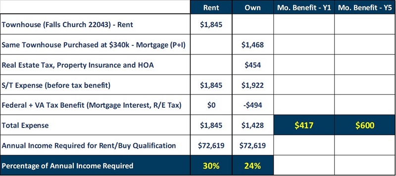 Here's a real-life example of comparing the cost to rent versus the cost to buy the same townhouse in our region (Falls Church 22043). How do I know? Because I'm the owner of the rental property. As shown in the table below, it takes $417 less per month to buy the subject home than is required to rent the same home. The $417/mo is represented by federal and state tax benefits associated with mortgage interest and real estate tax deductions, but it's still $417/mo extra take-home pay in the would be buyer's pocket every month. The U.S. tax code is written to benefit homeowners, not renters - take what is given to you. What's more, this $417/mo grows 45% to $600/mo by Year 5. The growth is accounted for by calculating the difference between escalating annual rent compared to just the real estate tax, insurance and HOA dues with ownership. Remember, buying a home usually involves a fixed-rate mortgage, meaning the principal and interest components of a mortgage never change. This represents 76% of the total payment to own in the example below, leaving just 24% subject to escalation. Conversely, 100% of the rent payment is subject to escalation each year. This spread is an annuity that keeps paying you when you own. However, when renting, this same amount is an annual pay raise for the landlord.