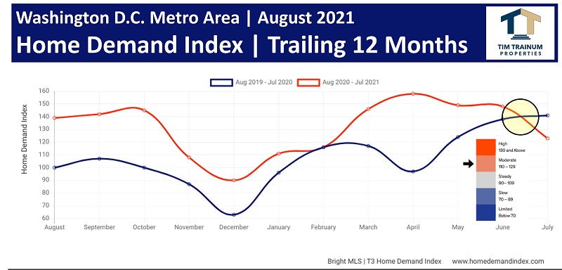 4. Home Demand Index Falls: The Home Demand Index (HDI) is a Bright MLS tool that measures and tracks housing demand, home prices, and home buying activities by analyzing property data gathered from the MLS. The HDI has fallen 35 points (22%) to 123 from an April high of 158. Similarly, the index has cooled to a whole new category from "high" to "moderate" demand across the Northern Virginia region. July marked the first time in the last 12 months when the HDI was below the level one year earlier. This crossover is further evidence of some of the rebalancing that is occurring between buyers and sellers.
