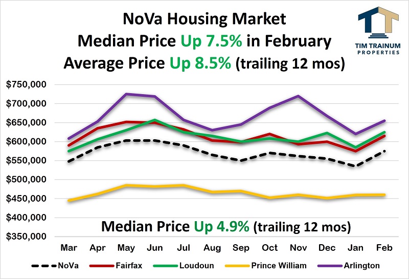 February Prices Trend Up, Still Below 2021 Highs: Overall, the median price of a Northern Virginia home spiked 7.5% during February. All sub-markets moved up during the month, except Prince William which was flat. The Northern Virginia median price remains 5% ($28,000) below the May 2021 high ($603,000). Inventory remains low, but new listings in February dramatically improved from down 22% last month to down only 3% in February. Active listings continue markedly down compared to last year (-38%), meaning new listings are quickly going under contract producing low days on market and contract terms that he...