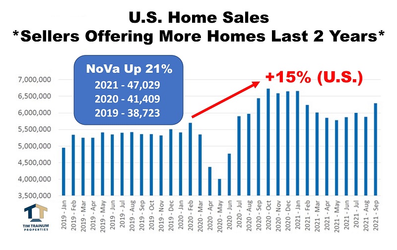 Buyers, Buyers & More Buyers: The two charts below basically tell the story. Most people are surprised to learn in 2021 there were 8,000 (21%) more homes sold in Northern Virginia compared to 2019. Contrary to what you may hear, sellers have been bringing more homes to market in force. Then, why is inventory still so low? The second chart answers that question. Northern Virginia has experienced a buyer surge in the last 18 months. This is best measured by the number of showings (buyer tours) scheduled at homes listed for sale on the MLS. In the recent four weeks alone, there are 41% more buyers now than during the same period in 2019. At times, this has been as high as 50% more buyers prospecting for homes.