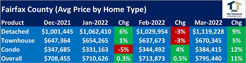 All Product Classes Moved Up in Price: As the saying goes, "all ships rise with the tide". The March rise in prices occurred across all product classes (detached, townhouse and condo). In Fairfax County as an example, the average price of a detached home increased by $90,000 (9%) in just one month. The average price now sits at $1,119,228 compared to $1,029,954 last month. Prices in Fairfax and Loudoun have prompted a reaction among many buyers and may be part of the recent price surge in Prince William. The average price of a detached home in Prince William is only $696,000 by comparison. Some buyers are pivoting to Prince William where they see 40%+ lower prices than Fairfax and Loudoun and trade-offs worth pursuing.