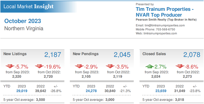 Last month, (September) marked the largest month-to-month fall in prices in over 6 years. Making this even more worth watching, Fairfax County, the area's largest sub-market carrying approximately 50% of Northern Virginia's activity, experienced a decline in median prices of 9.1%. Average prices declined ever sharper (-14%) with detached homes and condos carrying the move (townhome prices were unchanged). While significant, this is just a month-to-month move. It remains to be seen if this will be the beginning of a more impactful decline in home prices over time as desired by the Federal Reserve, or simply a relaxing of prices continued to be held up by low inventory.