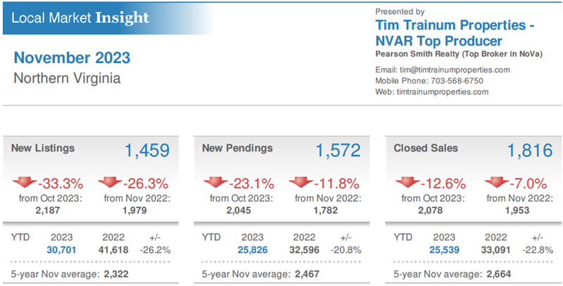 As of the week ending December 10, Listing and Showing movement are nearly equal. Seller listings are 65% below the 2023 highs seen in April, while buyer showings are down 56%. It's certainly still a seller's market, but buyers are navigating with less competition than earlier in the year. HOWEVER, there are still pockets of remarkable competition at certain price points, especially when rates opportunistically decline. As mentioned last month, a detached home in the Chantilly HS pyramid in pristine condition listed at $769,900 and received (41) offers! The home closed at $908,000 last week, escalating 18%, marking very unusual buyer behavior in today's market.