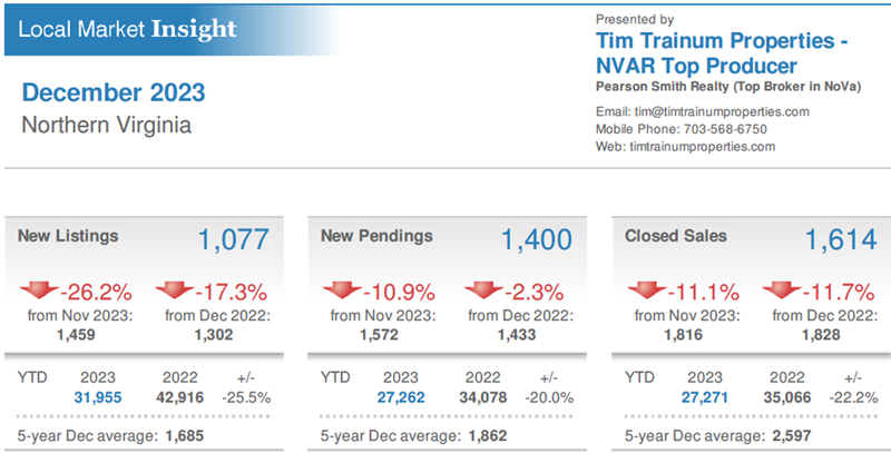 Northern Virginia finished strong with the average price appreciating $27,000 to close at $733,600. While prices were up, 2023 marked another year with declining home units sold (27,300). This is down 22% from the 35,100 homes sold in 2022, and down 42% from the 47,100 peak in 2021. Most sub-markets in Northern Virginia ranged from 3 to 9% appreciation with Manassas City leading ($30,000 appreciation on a $469,000 average price). Fairfax and Loudoun counties continued to lead Northern Virginia in terms of number of homes sold and average price. Fairfax closed the year with the top average selling price - $1,132,000 (detached homes). This compares to more affordable Prince William County finishing at $710,000 (37% less).