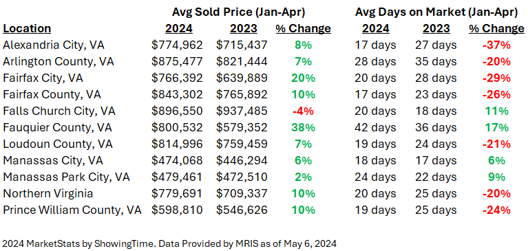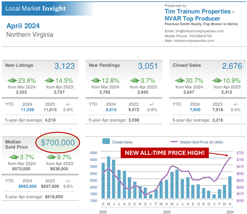 Northern Virginia and major sub-markets including Fairfax and Loudoun counties follow-through March highs and hit new all-time price highs in April. Prices continue to benefit from low inventory, down 2% compared to last year.
