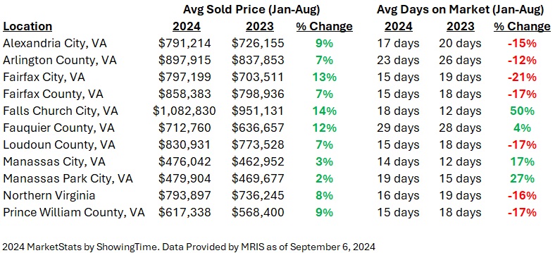 Seller listings have stabilized in 2024 and resisted the continued downtrend experienced in recent years. However, listings remain down significantly compared to long-term averages (-31%). Remarkably, the number of Northern Virginia homes sold from Jan-Aug (19,397) is almost exactly the same as last year (19,407).