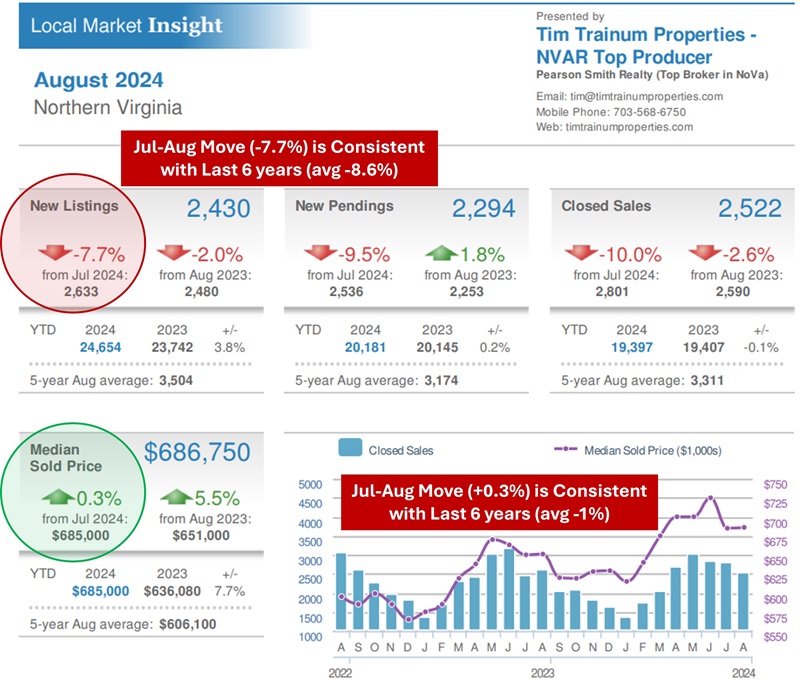 Northern Virginia prices held steady in August (contracts written in July). The July-Aug price move (+0.3%) was consistent with the last 6 years averaging DOWN 1%. The Jan-Aug YTD average price in Northern Virginia fell 90bp from 8.7 to 7.8% compared to the previous month's Jan-Jul YTD number. From July to December, the market typically gives back 40 to 75% of the price gains experienced in the January through the May/June peak.