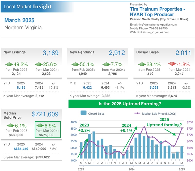 The median price of a Northern Virginia home increased 6.9% in March 2025 compared to March 2024. It typically takes a full Q1 to get a sense of how prices will trend for the year. Through March, the average home price in Northern Virginia is up 7.4%. Most notably, Loudoun County reached an all-time median price high in March ($810,000). Fairfax County is still 3% below its all-time high set last June ($780,000).