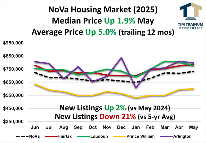 Inventory is finally rising in Northern Virginia. May inventory was 1.55 mos, 63% higher than May 2024 inventory of 0.95 mos. For several months, Active Listings have been running markedly higher than the previous year (currently 46% higher - 3,000+ listings in the DC Metro area). This presents a relatively more balanced buyer-seller market than experienced in 2020-24 when May inventory ranged from a slim 0.73 to 1.22 mos.
