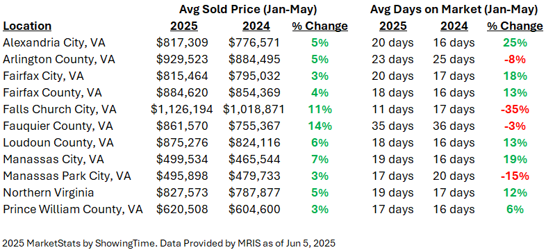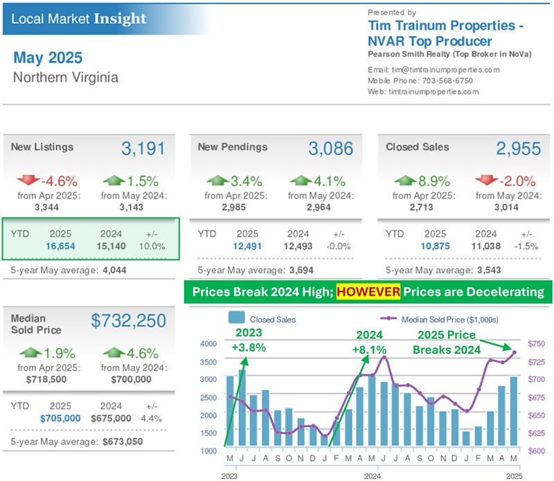 Despite rising inventory, the median home price in Fairfax County reached an all-time high in May ($787,000) breaking the former high ($780,000) reached in June 2024. However, home prices in Northern Virginia may be showing signs of plateauing as price internals are decelerating. The price increase for YTD 2025 compared to 2024 has been more than halved in the first five months of the year. Prices opened in January UP 11.2% but have deflated to UP 5% by May. The growing Active Weekly Listings trend that began in March 2024 has caused marked changes in inventory rising 50% over last year levels. This is further explained a few paragraphs below.