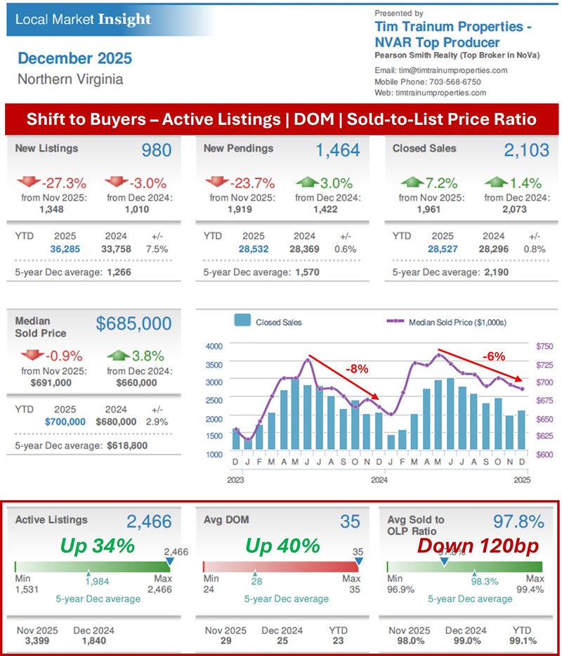 The upward trend in inventory since spring stabilized into fall and early winter. Northern Virginia home inventory traded in a relatively tight range from 1.76 to 1.91 months during April to October. November inventory fell to 1.43 months then followed through falling to 1.04 months in December. This is typical end of year behavior with fewer New Listings from sellers. Generally, this remains a seller-advantaged level of inventory but is up significantly from the previous November (+38%) and December (+33%). The increase in inventory is reflected in three important market metrics all tracking significant buyer-friendly variances from December 2024 - Active Listings (UP 34%), Days on Market (UP 40%), and Sold-to-List Price Ratio (DOWN 120bp). Despite this market shift toward buyers, prices held relatively strong in 2025 finshing the year UP 4.4%. The increase lags long-term and short-term averages. Long-term, Northern Virginia is UP 5.25% per year since 1975, and UP 7.5% per year since 2020.