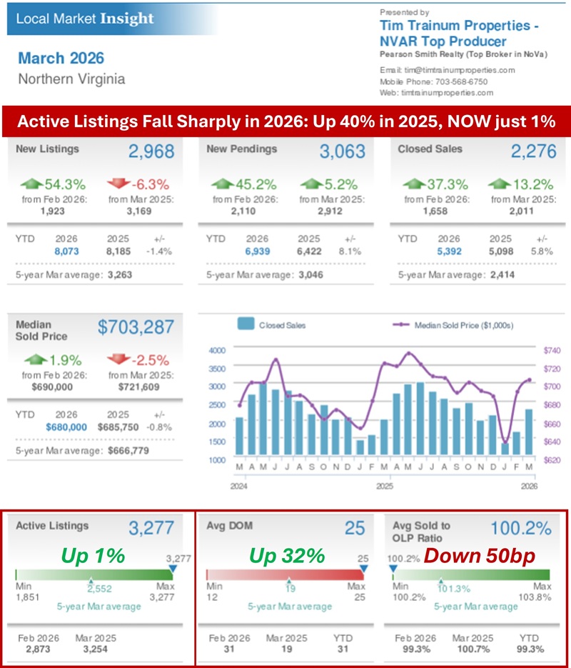 Inventory in Northern Virginia is steady in 2026 after 2025's fast-paced uptrend over 2024. March inventory of 1.37 months was almost equal to the 1.39 months in March 2025. Inventory has been held down with the rapid decline in Weekly Active Listings (currently just 1% higher - 100 listings in the DC Metro area). This presents a relatively more balanced buyer-seller market than experienced in 2020-24 when March inventory ranged from just 0.48 to 1.20 mos.